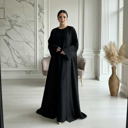 Metallic Diamanté Stud Open Abaya Set with Slip and Hijab, Available in Two Colours