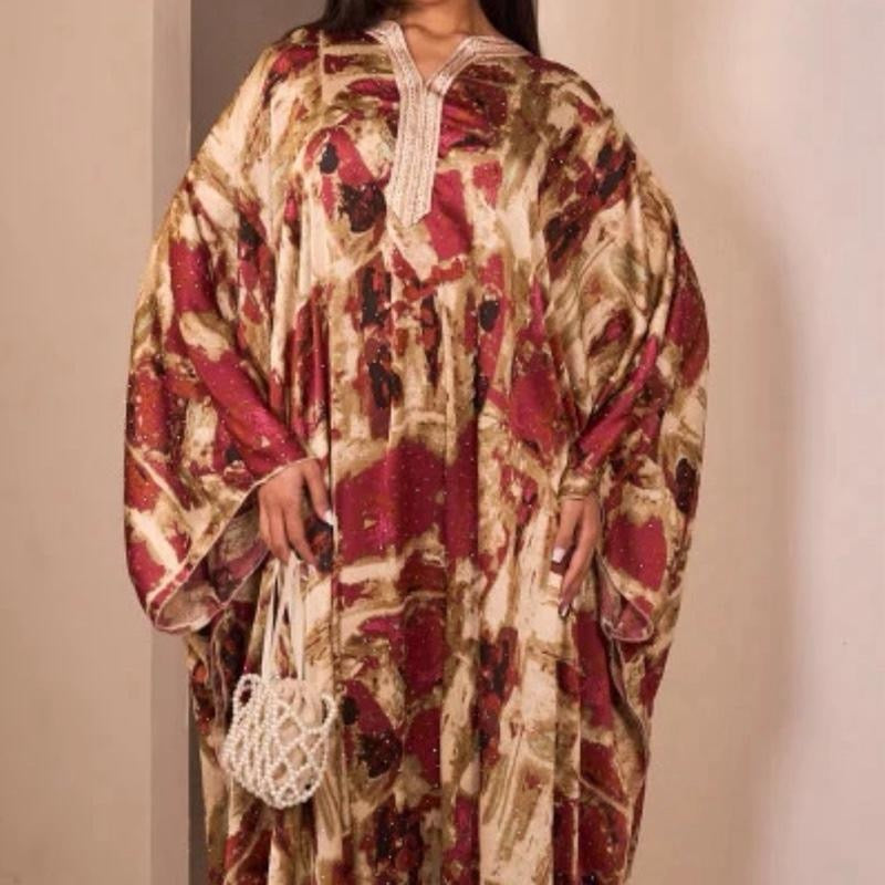 Introducing our ladies silk floral print kaftan dress, a perfect addition to your wardrobe. This dress is designed to provide comfort and style to the wearer. Material is made out of 95% Viscose, 5 % Elastine. The silk material used in the dress is soft and comfortable to wear, making it perfect for all-day wear. The floral print design adds a touch of elegance and femininity to the dress, making it suitable for various occasions. The kaftan style of the dress is loose and comfortable, allowing for ease of movement. The one-size design of the dress makes it versatile and can fit a range of body types. The dress is available in one size, which is UK size 6-14. This means that it can fit a range of body types, making it a great choice for those who want a comfortable and stylish dress. The dress is perfect for those who want to look stylish and feel comfortable at the same time. The silk material used in the dress is soft and comfortable to wear, making it perfect for all-day wear. The floral print de adds a touch of elegance and femininity to the dres making it suitable for various occasions. The kaftan style of the dress is loose and comfortable, allowing for ease of movement. The one-size design of the dress makes it versatile and can fit a range of body types. The dress is available in one size, which is UK size 6-14. This means that it can fit a range of body types, making it a great choice for those who want a comfortable and stylish dress. The dress is perfect for those who want to look stylish and feel comfortable at the same time. The silk material used in the dress is soft and comfortable to wear, making it perfect for all-day wear. The floral print design adds a touch of elegance and femininity to the dress, making it suitable for various occasions. The kaftan style of the dress is loose and comfortable, allowing for ease of movement. The one-size design of the dress makes it versatile and can fit a range of body types. Get your hands on this beautiful dress and experience the comfort and style it provides. Approximate measurements: Kaftan Length: 50 Inches. Chest: 30-31 Inches one way.